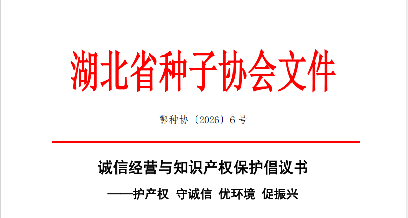 湖北省种子协会文件鄂种协〔2026〕6号诚信经营与知识产权保护倡议书——护产权 守诚信 优环境 促振兴湖北省种子协会全体会员及湖北种业同仁:为进一步规范种业市场秩序,优化市场环境,维护公平竞争,促进种业高质量发展,保障国家粮食安全与种业安全,湖北省种子协会谨向全体会员单位及全省种业同仁,发出如下倡议…