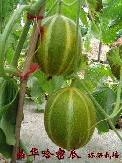 特性特征:哈密瓜早熟品种。果实成熟期35天,植株长势中等。单瓜重1.3-1.5公斤,果皮黄绿,沟肋明显,果肉浅绿色,肉厚3.5厘米,折光糖含量16%。外形独特,品质香甜浓郁,综合抗性优良,抗逆性强,耐贮运,采收后常温下储藏15天,味道基本不变。适于春秋保护地和露地栽培。 栽培要点:适于极早熟栽培,12月下旬-2月上旬播种栽培。延秋栽培7月上旬播种。长江中下游地区露地栽培,宜采用双蔓整枝,株行距50cm×200cm,6节左右孙蔓留果,单株留果3个,成熟前一周停止供水以确保品质。大棚栽培株。