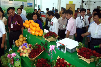 6月13日,参展代表在参观桂林市农产品水果展示。当日,为期3天的2006东南亚农业生产资料(广西)交易会在桂林开幕,150多家境内外企业参展。 新华社发(赵家志摄)
