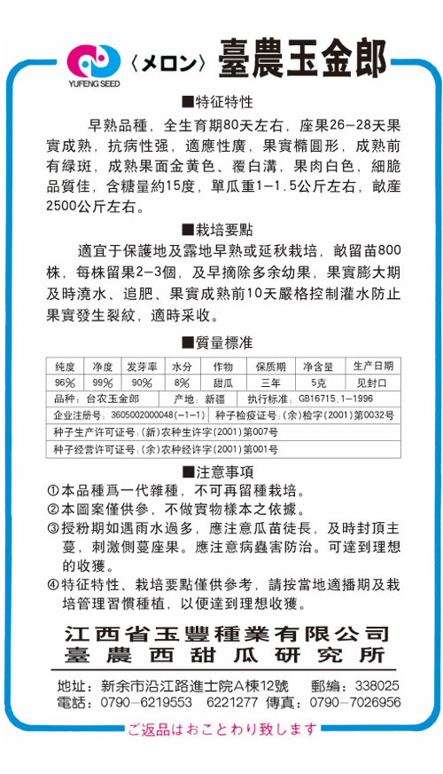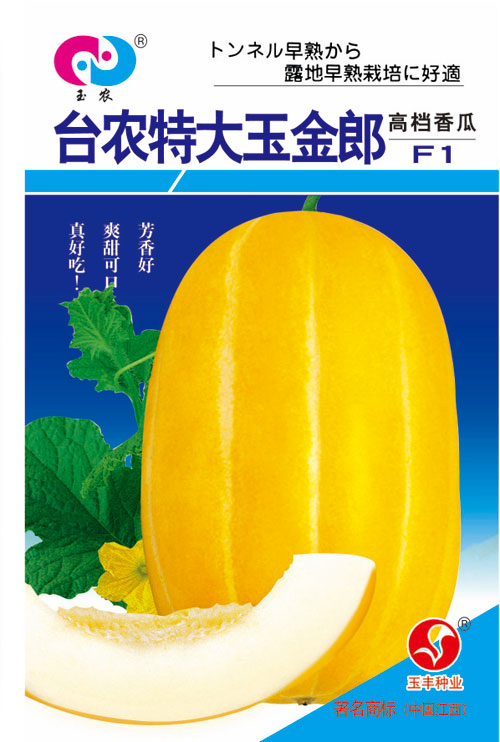早熟品种,全生育期80天左右,座果26-28天果实成熟,抗病性强,适应性广,果实椭圆形,成熟前有绿斑,成熟果面金黄色、覆白沟,果肉白色,细脆品质佳,含糖量约15度,单瓜重1-1.5公斤左右,亩产2500公斤左右。 包装正反面展示图:
