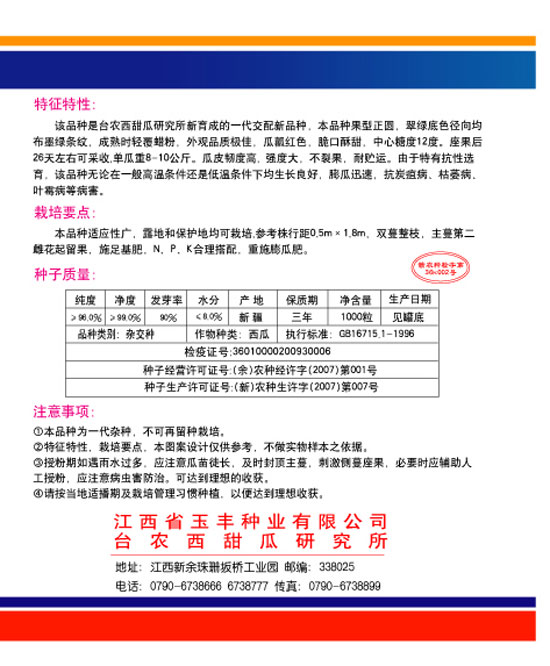 该品种是台农甜瓜研究所跨世纪新育成的一代交配品种,本品种果型正圆,翠绿色径向均布墨绿条纹,花纹清晰不乱,不杂,成熟时轻覆蜡粉,瓜瓤红色,脆口酥甜,瓜香宜人,中心糖度13.7度。座果后22天左右即可采收,单瓜重8-10公斤。瓜皮韧度高,强度大,不裂果,极耐贮运。该品种无论在高温条件还是低温条件下均生长良好,膨瓜迅速,高抗炭疽,叶霉等病害。