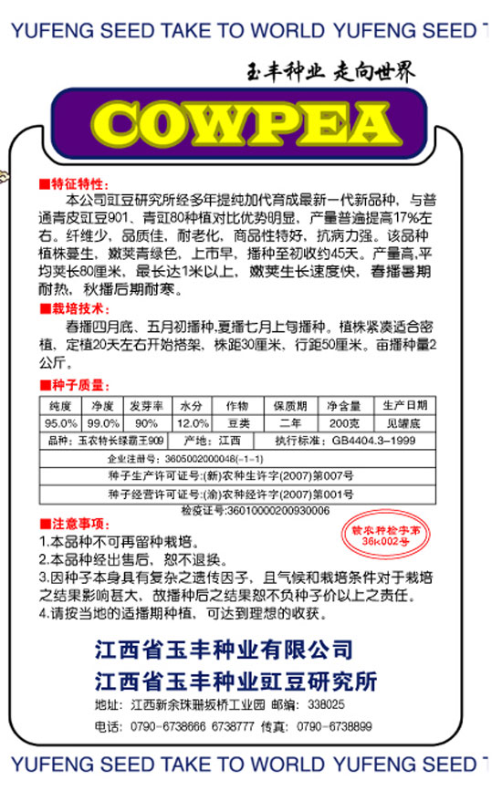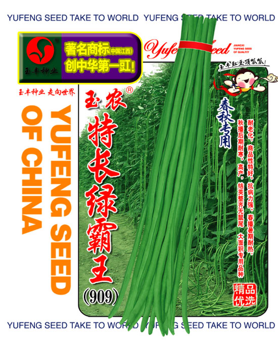 本公司豇豆研究所经多年提纯加代育成最新一代新品种,与普通青皮豇豆901、青豇80种植对比优势明显,产量普遍提高17%左右。纤维少,品质佳,耐老化,商品性特好,抗病力强。该品种植株蔓生,嫩荚青绿色,上市早,播种至初收约45天。产量高,平均荚长80厘米,最长达1米以上,嫩荚生长速度快,春播暑期耐热,秋播后期耐寒。