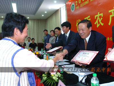 图为:第二届农博会颁奖大会会场,有关领导为获奖者颁奖 记者林坚/摄