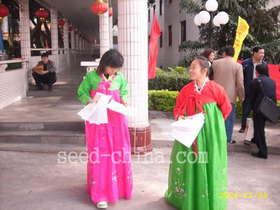 如今中国的不少种子都来源于韩国,瞧,会议还没有正式开始,一些企业就开始宣传他们的韩国种子了,公司员工穿着韩服,也别有一番风味。