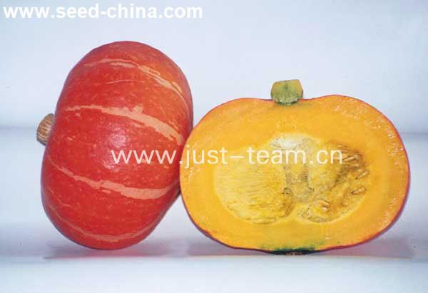 极早熟,长势旺,低温结果性强,抗病,每株可结果3个左右。重约1.5kg,果皮橙红色,带有淡黄色细条带,果实厚扁球形,外观艳丽,商品性佳,果肉厚,鲜橙色,甘甜如栗,粉质细密,品质上佳,贮藏性好。