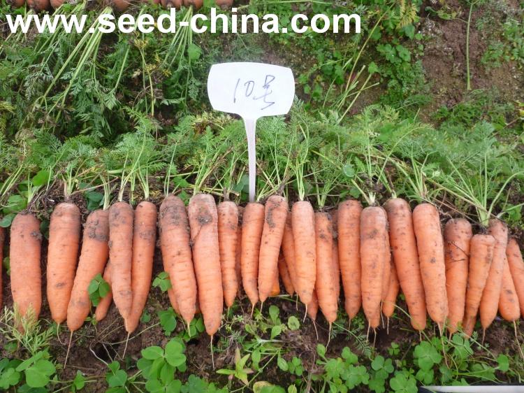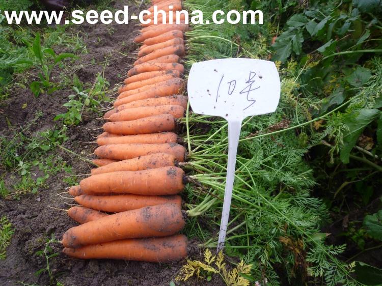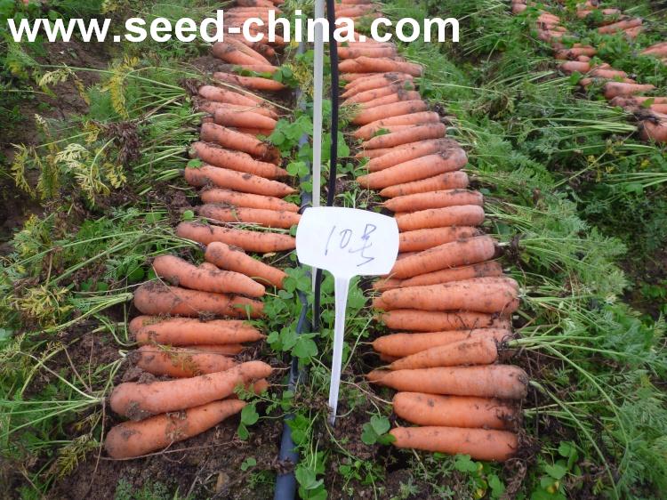 一代杂交基地专用特大长圆柱形特高产量胡萝卜,根型优美,呈圆柱型,根型上下均匀,收尾好,无大头现象,播种后110-160天既可收获,可延迟采收,芯韧三红,表皮光滑,不易裂根,根长一般在22-25CM左右,直径约为5厘米左右,单根重400-600克,平均亩产6000公斤以上,最高亩产可达8000公斤。是目前引进的贮藏、加工、出口的专用品种。
