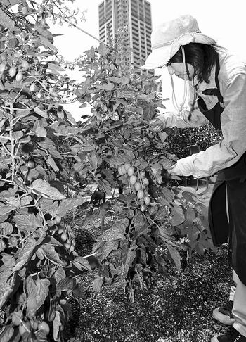 图为一位农艺师在日本大阪市中心一栋大型商业中心楼顶的“迷你农场”修剪蔬菜。这个“迷你农场”占地250多平方米,栽种有西红柿、黄瓜、茄子等各种家常蔬菜。楼顶“迷你农场”作为高楼屋顶绿化的一部分有效降低了楼顶温度,缓解了混凝土高楼的热岛效应。同时,在寸土寸金的商业中心区,它也成为市民休闲放松、亲近自然的好去处。