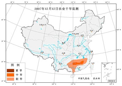 目前,北方冬麦区大部墒情较为适宜,仅山西西南部和河南西北部等地存在不同程度的旱情。江南中南部、华南大部基本无降水,湖南和江西中南部、福建西部、广东北部和西部、广西北部和东部、贵州东南部旱情持续。