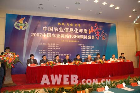 农博网讯 2007年,是中国农业信息服务快速发展的一年,农村网民数量突破3700万人,农业信息化已经成为加快建设现代农业的重要途径,成为农民创造收益的有效手段。为了探讨在新形势下农业网站如何迎接新的发展机遇,全面商讨农业信息化发展大计,共同交流经验,由农业部信息中心、中国互联网协会、中国电子商务协会共同主办,农博网承办的中国农业信息化年度峰会暨2007中国农业网站100强颁奖盛典12月20日在北京梅地亚中心隆重召开。