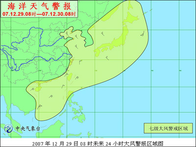 预计,29日08时至30日08时,受强冷空气影响,渤海、黄海大部海域将有8-10级、阵风可达11级的西北风;东海大部海域将有7-9级偏北风;台湾海峡、台湾以东洋面及以南海域、南海大部海域、北部湾海域将有7-9级东北风。日本以南洋面将有6-8级西北风;日本海、日本以东洋面将有9-11级大风。