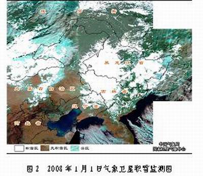 截至元月2日,辽宁中北部积雪深度有3-9厘米,黑龙江中东部、吉林东部有8-16厘米,其中黑龙江东部积雪深度达20-46厘米;从2008年1月1日气象卫星积雪监测图显示,内蒙古中东部的部分地区和东北部、东北大部分地区被积雪覆盖。