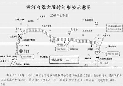 内蒙古气象台消息,目前黄河内蒙古段封河长度为665公里,即将全线封河。上图是内蒙古自治区防汛抗旱指挥部制作的1月4日黄河内蒙古段封河示意图。