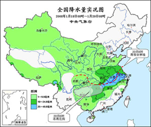 1月18日以来,我国中东部地区再次出现大范围雨雪天气。1月18日08时-20日08时,(图示)新疆、青藏高原、西北地区东部、内蒙古西部、华北西部、黄淮、江淮、江汉地区以及江南偏北部地区降了小到中雪,河南东部和南部、湖北东部和北部、安徽中北部、湖南偏北部地区出现大雪或大暴雪;其中,河南东部、安徽中北部、湖北东部、湖南北部地区降水量普遍在10毫米-19毫米,湖北东部、安徽中部等地降水量有20毫米-28毫米,累计降水量超过30毫米的站点有:湖北的黄石(32毫米),安徽的巢湖(31毫米)、太湖(36毫米)、安庆(41毫米)(图示)。另外,安徽南部、江苏、湖南、江西、浙江中北部、广西、四川东部、重庆等地出现小到中雨,贵州大部、湖南中北部地区持续出现冻雨天气。