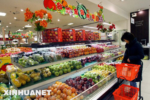 1月14日,顾客在上海一家大型超市的“台湾宝岛水果”专柜前选购。据悉,2007年春节期间将有包括莲雾、青檬、芭乐、杨桃、柳丁等约100吨台湾水果供应上海市场。 新华社记者 刘颖 摄