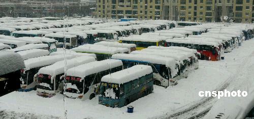 1月28日,安徽省合肥市长途汽车站内的大客车被暴雪复盖。连续十几日的暴雪纷飞,导致部分长途客运瘫痪,至少上万名乘客滞留合肥。据气象部门最新资料分析,2月1-2日安徽省还将有一次降雪天气;3日后安徽天气有望转好。中新社发成展鹏 李君 摄
