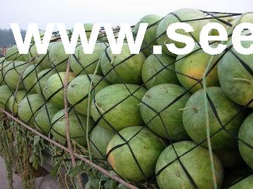 品种特性:中熟。全生育期110天,果实32天成熟。长椭圆形,果皮深绿网纹,皮韧耐贮运。单果重12kg,最大达30kg以上,亩产量(两茬瓜)15000斤以上。大红瓤,果肉脆沙,含糖量12.5%。口感佳。长势稳健,易坐果,抗病性强,适应性广。