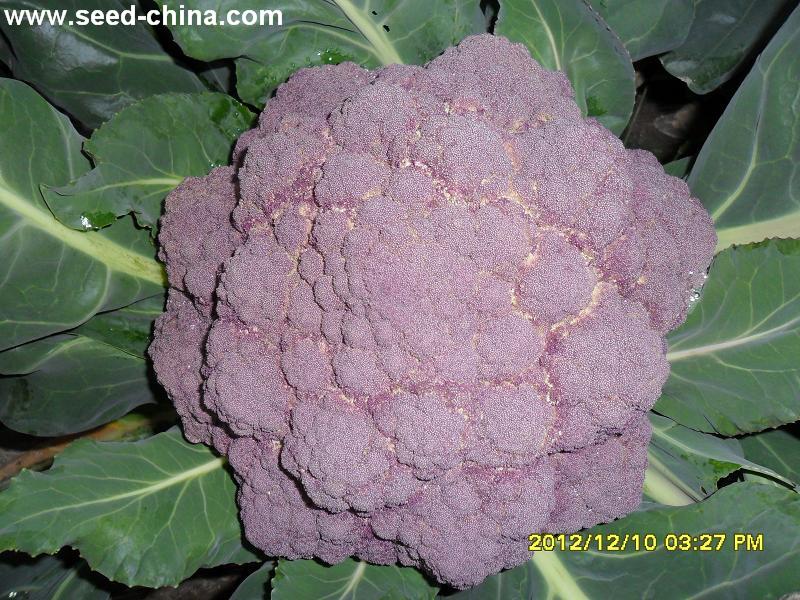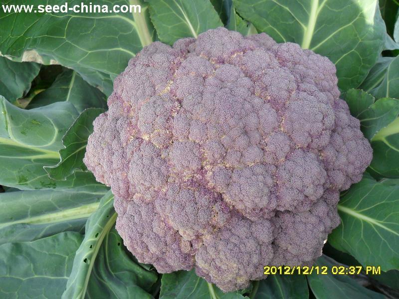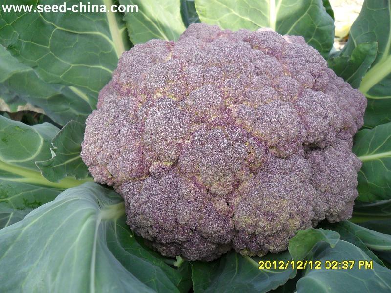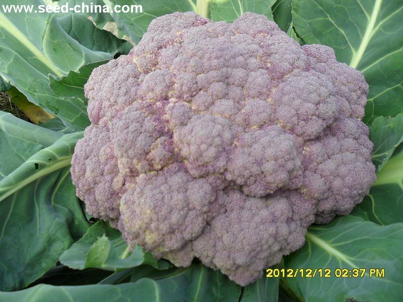 紫菜花品种,中晚熟,植株生长势强,成熟期80天左右,花球尖圆头型,表面呈紫红色,着色均匀,蕾粒细,球径在12-15厘米左右,单球重400-500克,很少抽生侧枝,田间表现抗病性强。