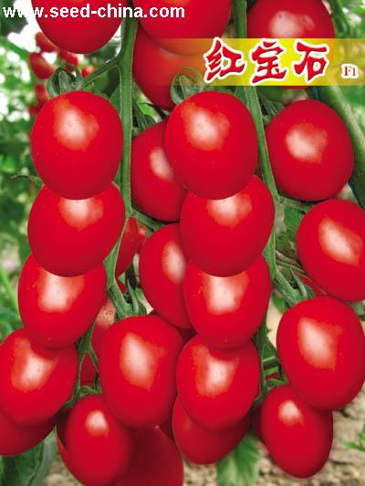 红宝石-番茄种子无限生长类型,生长势强。红果,果实椭圆形,单果重15-20克左右,果柄有节,果实排列密集,单穗可结15-30个果,果肉厚,果色艳丽,风味甜美,不易裂果,可溶性固形物含量高、商品性好、产量高、采收期长,耐贮运。抗病性强,适应范围广。