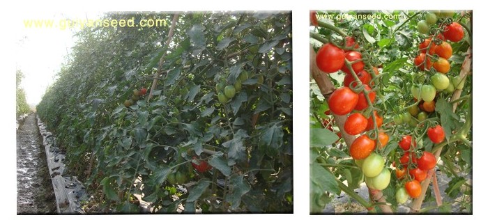 本品种是从欧洲引进的杂交小型水果番茄,无限生长,中早熟,耐高温高湿,耐低温弱光,座果力强,不易落花落果,耐裂果,硬度高,耐贮运,货架期长,果实大小均匀,椭圆形,红色靓丽,光泽度好,单果重18—20克左右,肉脆,糖度高,口感好,商品性一流,萼片展开,花序穗形整齐,每穗挂果多达20—30个,穗位高度一致,可整穗采摘,植株长势强,根系发育好,抗病毒病、青枯病、早疫病、叶霉病等。植株不早衰,产量高,亩产超过5000公斤。建议高垄种植,亩栽2000株左右。适应性广,适合南方露地秋、冬、春种植,是番茄种植基地的理想品种。