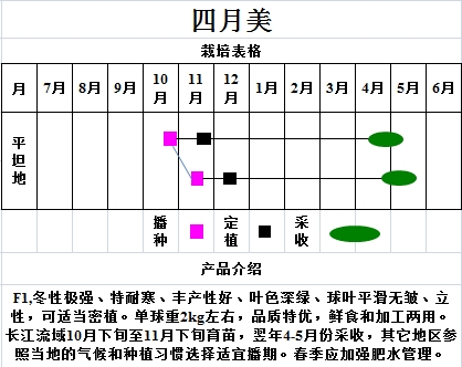产品介绍:F1冬性极强、特耐寒、丰产性好、叶色深绿、球叶平滑无皱、立性,可适当密