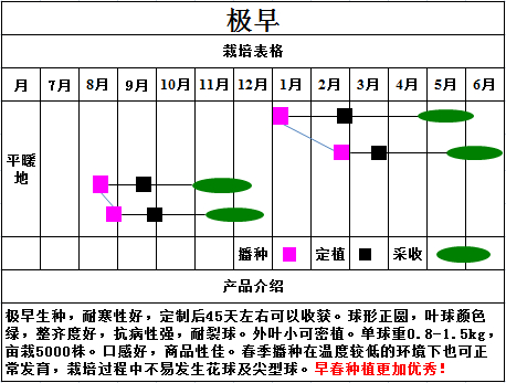 产品介绍:极早生种,耐寒性好,定植后45天左右可以收获,球重0.8-1.5Kg。叶球鲜绿有光泽,裂球迟,外叶小可密植。对黑腐病抗性强,口感好,商品性佳。春季播种时在较低温度条件下也可正常发育,栽培过程中不易发生花球及尖形球。