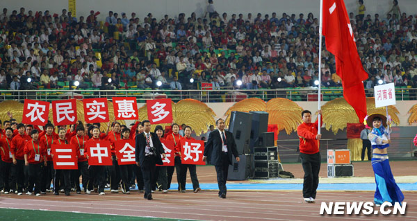 河南省代表团的入场标语写到,“三中全会好,农民实惠多”!党的十七届三中全会提出了一系列富农、强农的好政策,深得人心。河南作为人口大省、农业大省和粮食大省,对中央的新政策感受最深。参加开幕式的河南省代表团毽球花毽队领队赵转星告诉记者:“昨晚我们团部全体人员商量了一宿,觉得在这个农民的盛会上,理应表达出我们广大农民的心声”。