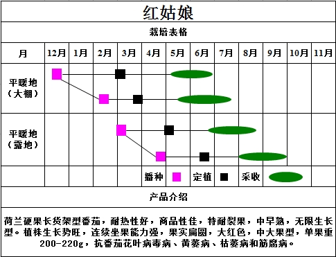 荷兰硬果长货架型番茄,耐热性好,商品性佳,中早熟,无限生长。植株生长势旺盛,连续坐果能力强,果实扁圆,大红色,中大果型,单果重200-220g左右,抗番茄花叶病、黄萎病、枯萎病和耐筋腐病。