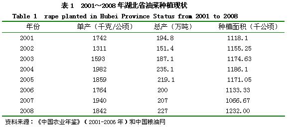 经过样本数据与模型的测算,得到1991-2008年间,科技进步的贡献率为18.09%。华中农业大学与中国农业科学院油料作物研究所均位于湖北,它们是全国油菜科研实力最强的单位,2000年以来,它们共有13个品种通过了湖北省的审定,5个品种通过了国家的审定。其中华杂系列、中油杂系列、华双和中双系列均为优良品种。