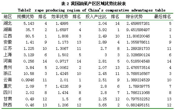 如果T﹥1,即认为油菜对于小麦有比较优势,数字越大,优势越大,反之,即认为油菜对于小麦没有比较优势。本文选择2005年的数据,进行测算。经过计算后的结果如下: