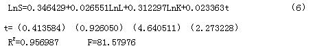 是反映 技术进步对t年度产出的影响系数。C-D生产函数是α+β+δ次的齐次函数;若α+β+δ=1,则规模收益不变,若α+β+δ〈1,则规模收益递减,若α+β+δ〉1,则规模收益递增。同时农业生产中的许多无法控制的变量,如光照、雨量,以及生产中的损失和统计的误差,它们用随机变量ε表示。在实际求解中,通常对(2)式取自然对数,转化为多元的线性回归形式来求解。具体如下: