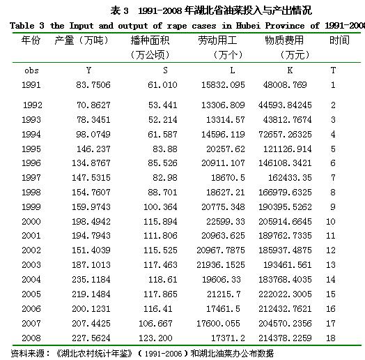 土地(S)用播种面积来表示。农作物播种面积是指当年农业中的实际播种面积和新移植的油菜的面积。资本(K)用物质费用表示,包括直接物质费用和间接物质费用。具体的是化肥费、农药费、农家肥、种子费、劳动用工费、机械使用费、固定资产折旧费和管理及其他费用。劳动(L)用标准劳动用工数,具体包括家庭直接用工和雇工天数。产出(Y)用历年(1991-2008)湖北省油菜总产量来表示。