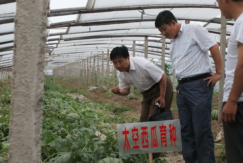 遨游太空促变异,回归地面结硕果。继太空小麦收获后,山东省平度市太空西瓜及樱桃番茄也已成熟。6月19日上午,崔家集镇大黄埠村的平度市太空西瓜及番茄育种基地,青岛市农业科学院专家正在对成熟待采的太空西瓜和番茄进行"把脉"。