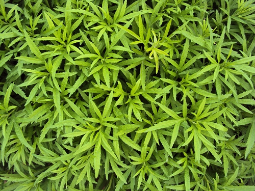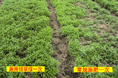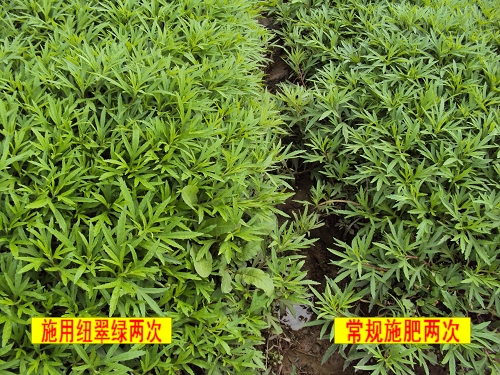 小苗时冲施纽翠绿四天后,藜蒿新叶发得明显更多,颜色为嫩黄色,且苗发得更齐整更壮。