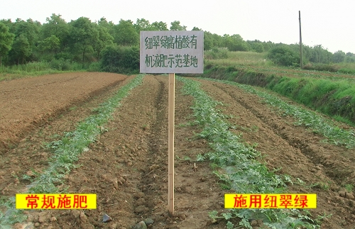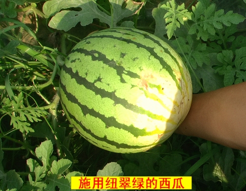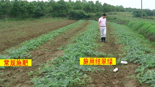 江夏五里界西瓜用纽翠绿灌根,十天后西瓜瓜蔓更长,且基本没有青枯病的发生,抗病能力明显增强。