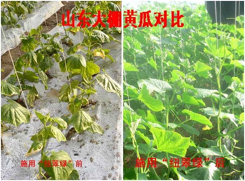 受化工污染萎焉的黄瓜,冲施纽翠绿后,生长点重新激活,植株根繁叶茂,花多瓜直。