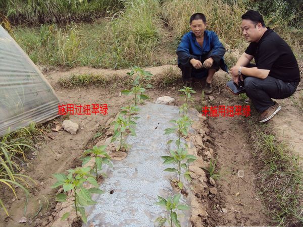田间施用前后对比明显,施用过“纽翠绿”的辣椒苗长势喜人
