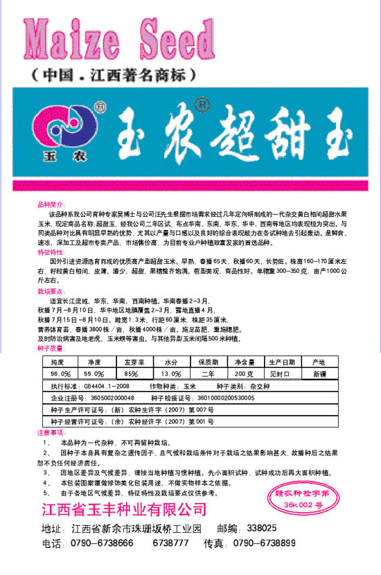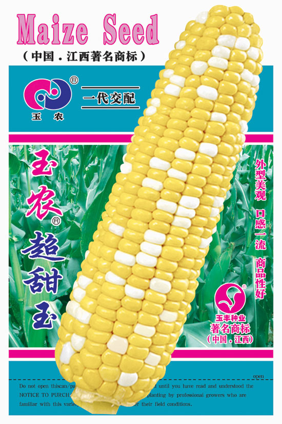 国外引进资源选育而成的优质高产型超甜玉米。早熟,春播65天,秋播60天,长势旺。株高120-140厘米左右,籽粒黄白相间。皮薄,渣少,香甜,果穗整齐饱满。苞型美观,商品性好。单苞重300-350克,亩产1000公斤左右。 产品包装正反面展示