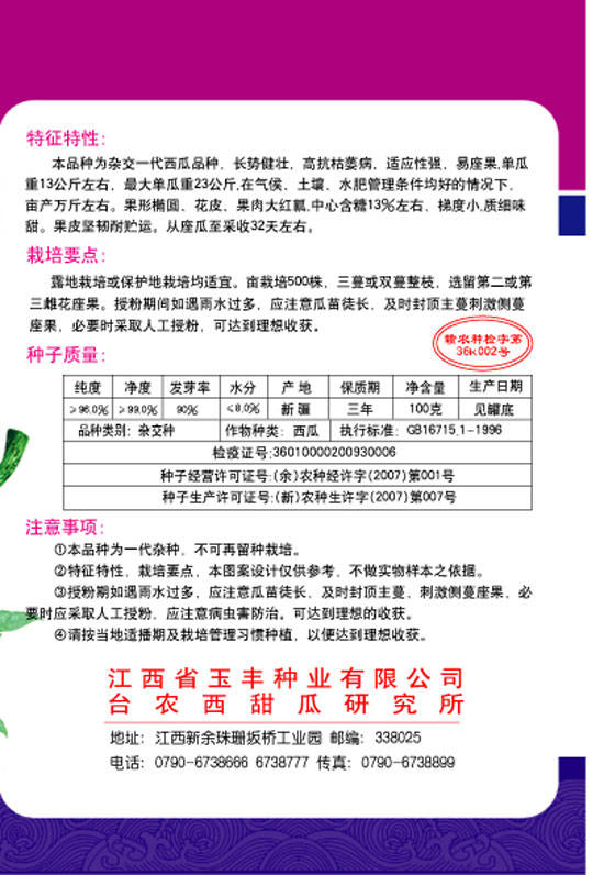 本品种为杂交一代西瓜品种,长势健壮,高抗枯萎病,适应性强,易座果,单瓜重13公斤左右,最大单瓜重23公斤,在气候土壤,水肥管理条件均好的情况下,亩产万斤左右。果形椭圆,花皮,果肉大红瓤,中心含糖13%左右,梯度小,质细味甜。果皮坚韧耐贮运。从座果至采收32天左右。