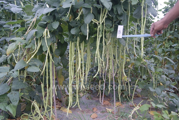 该品种早中生,分枝中等,产量高,主蔓4-5节着生雌花序,嫩荚嫩绿色,荚长75-80cm,荚条粗0.9-1cm,肉厚,质嫩,耐老化,不鼓籽,无鼠尾,荚面平滑,上下粗细均匀,栽培得当采收期长,对荚多而整齐,商品率高。