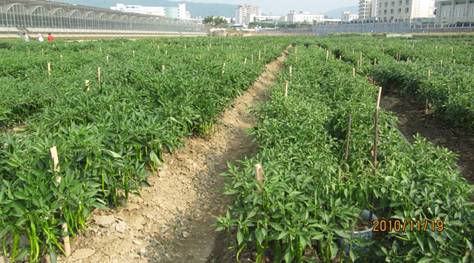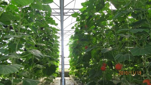 品种长势:大田各类作物品种长势良好,番茄类展会开始后会见红果;辣椒类总体坐果很好,红椒类已渐转红;茄子类已经挂果;叶菜类长势旺盛;瓜类结果良好。温室中甜瓜、苦瓜、西瓜、南瓜等瓜类大部分挂果完成,青瓜、节瓜、丝瓜等瓜类进入结果期。