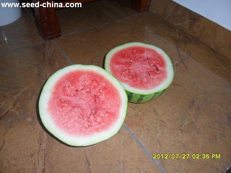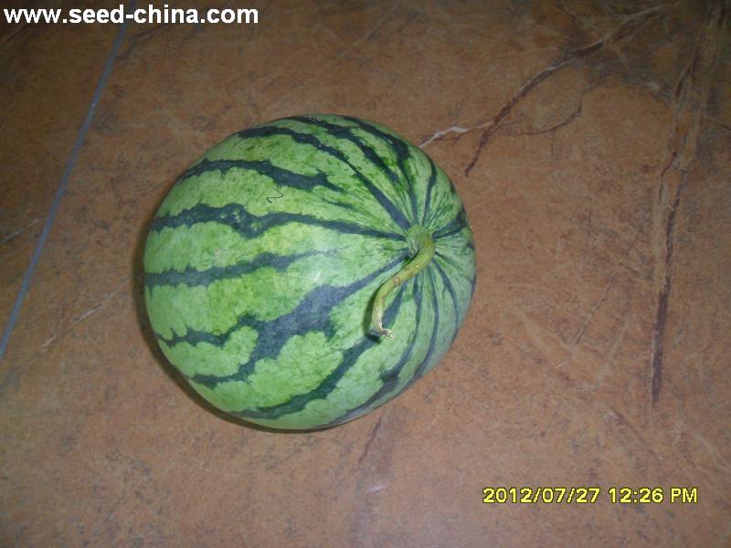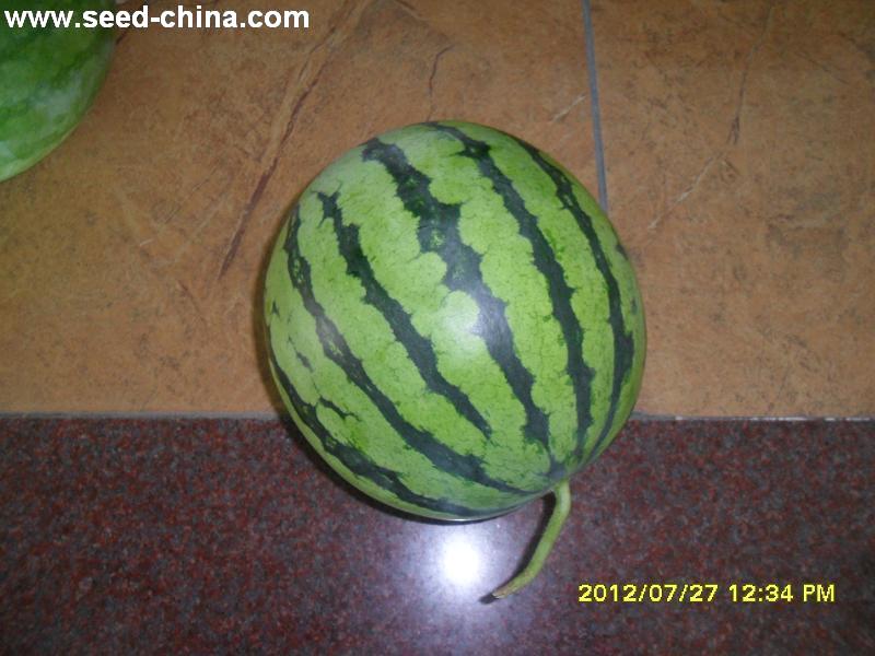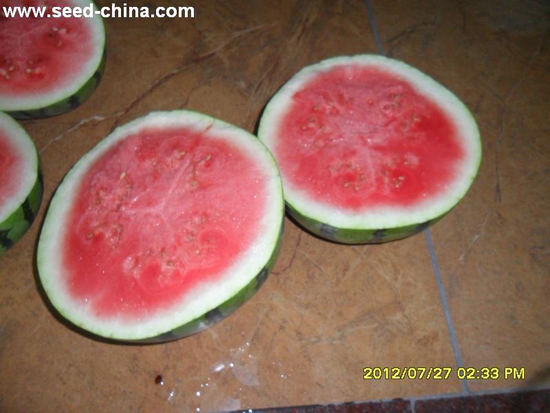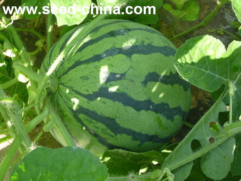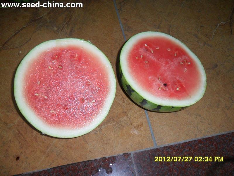 中早熟优质无籽西瓜一代杂种。低温弱光下好座瓜,开花后28-30天左右成熟。生长势强,瓜码较密,圆果,绿底条纹,有果霜,蜡粉较少,单瓜重6-7kg左右。果肉脆嫩,糖度高、口感好等优点。中心甜度量达12度以上,糖度梯度小。果肉桃红色,着色均匀,纤维少,不易倒瓤。皮薄耐贮运。高抗枯萎病,兼抗炭疽病,一般亩产4000公斤以上。适合保护地和露地栽培。在生产上要注意不要低节位座瓜,否则易出现着色瘪籽。