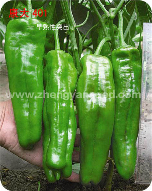 郑州市蔬菜研究所继康大301后育成的康大系列优秀大果型牛角辣椒新品种。该品种较康大301早熟7天左右,前期挂果集中,长势较强,果实为粗长牛角型,膨大速度快,一般果长为20-26cm,果粗4-5cm,单果重150g左右,大果可达260g以上。果色翠绿,商品性佳。适合春秋大棚、中棚、小棚栽培,春露地及日光温室也可栽培。