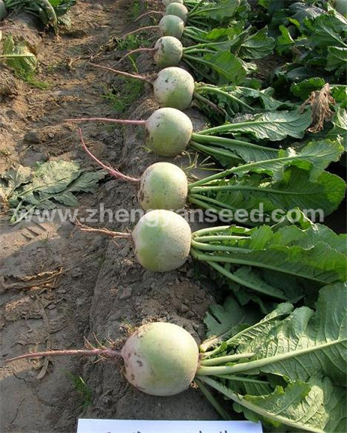 郑研心里美萝卜是我所萝卜课题专家精心选育的水果型萝卜新品种。该品种板叶型,叶簇半直立,深绿色。肉质根表皮光滑,上部淡绿色,入土部分为白色。肉质根长12~15厘米,横径10~14厘米,单个重500克~700克,大的可达1300克以上。根肉为鲜艳的紫红色,艳丽如花,极惹人喜爱,生食味甜质脆,适宜凉拌和雕刻。