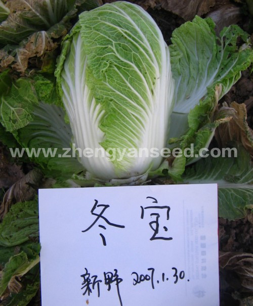 抗寒型中晚熟大白菜新品种。全生育期80-85天。外叶深绿色,内叶翠绿,叶帮绿白。叶球合抱,呈短炮弹型,球高26-30厘米,横径24-26厘米,球形圆整规则,不易脱帮。单球重4.5-5.5公斤,亩产高达13000-15000斤。生长势强,对霜霉病、病毒病和软腐病等病害抗性较强。外观和品质均属上乘,耐贮耐运,深受农户和消费者青睐。适应性强,适合河南、山东、陕西各省及其以南各区域栽培,其中淮河流域及其以南地区可以露地越冬,延长采收期。