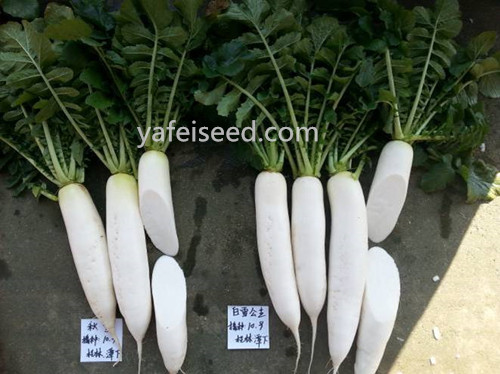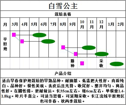 最适合春季播种,低温肥大性极优的晚抽苔青首萝卜。适期播种后60天可收获,根形美观,收尾好,耐热性好,对黄萎病抗性强。