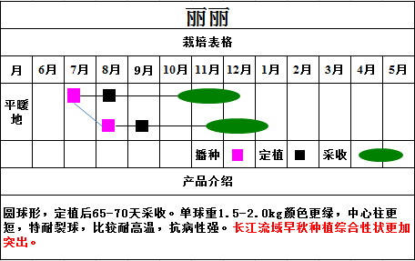 圆球形,商品性极佳。定植后60-65天采收,单球重1.5-2.0kg,鲜绿色,中心柱短,特耐裂球,抗病性强,是日本最具震撼力的品种之一。