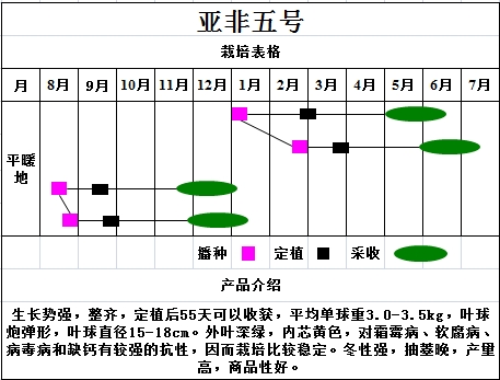 生长势强,整齐,定植后55天可以收获,平均单球重3.0-3.5kg,叶球炮弹形,叶球直径15-18cm。外叶深绿,内芯黄色,对霜霉病、软腐病、病毒病和缺钙有较强的抗性,因而栽培比较稳定。冬性强,抽薹晚,产量高,商品性好。