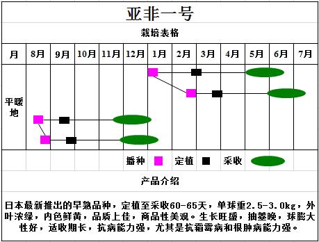 日本最新推出的早熟品种,定植至采收60-65天,单球重2.5-3.0kg,外叶浓绿,内色鲜黄,品质上佳,商品性美观。生长旺盛,抽薹晚,球膨大性好,适收期长,抗病能力强,尤其是抗霜霉病和根肿病能力强。