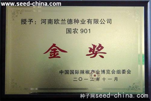 2012年11月1日至11月3日,在湖南长沙隆重召开了第四届中国国际辣椒产业博览会,欧兰德公司在会议期间展示了20多种辣椒实物,主要有大牛角椒、羊角椒、线椒、皱皮椒等,吸引了诸多参会朋友驻步观摩。其中“国农901”在众多泡椒品种中脱颖而出,中国国际辣椒产业博览会组委会专家一致认为该品种果个大、果色亮绿、大小一致,是大果牛角椒中的代表品种,组委会特授予:河南欧兰德种业有限公司“国农901”金奖。
