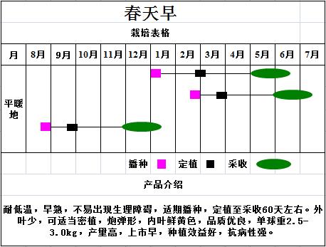 耐低温,早熟,不易出现生理障碍,适期播种,定植至采收60天左右,外叶少,可适当密植,炮弹形,内叶鲜黄色,品质优良,单球重2.5-3.0kg,产量高,上市早,抗病性强,种植效益好。